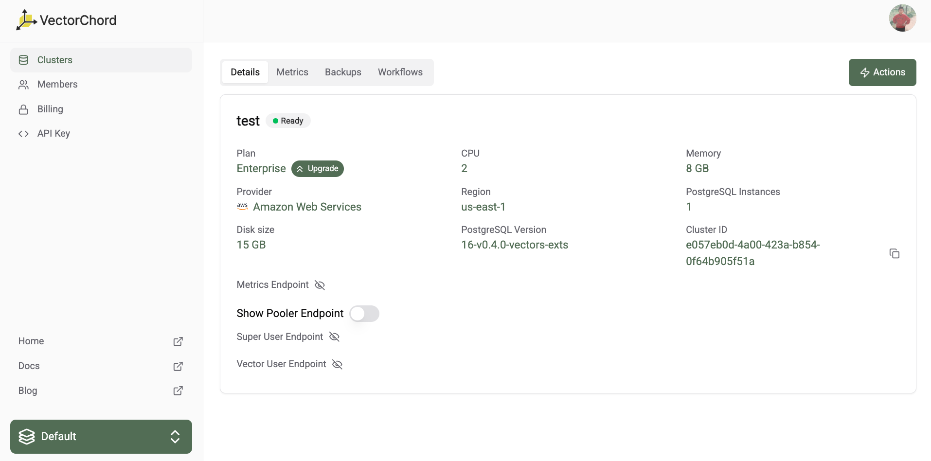 You can view the cpu utilization, memory usage and PGData disk total and usage of your cluster in the metrics page. And you can also view the index info for example the number of vectors in the index, the dimension of the vectors etc. For detailed information about monitoring, see Monitoring.
